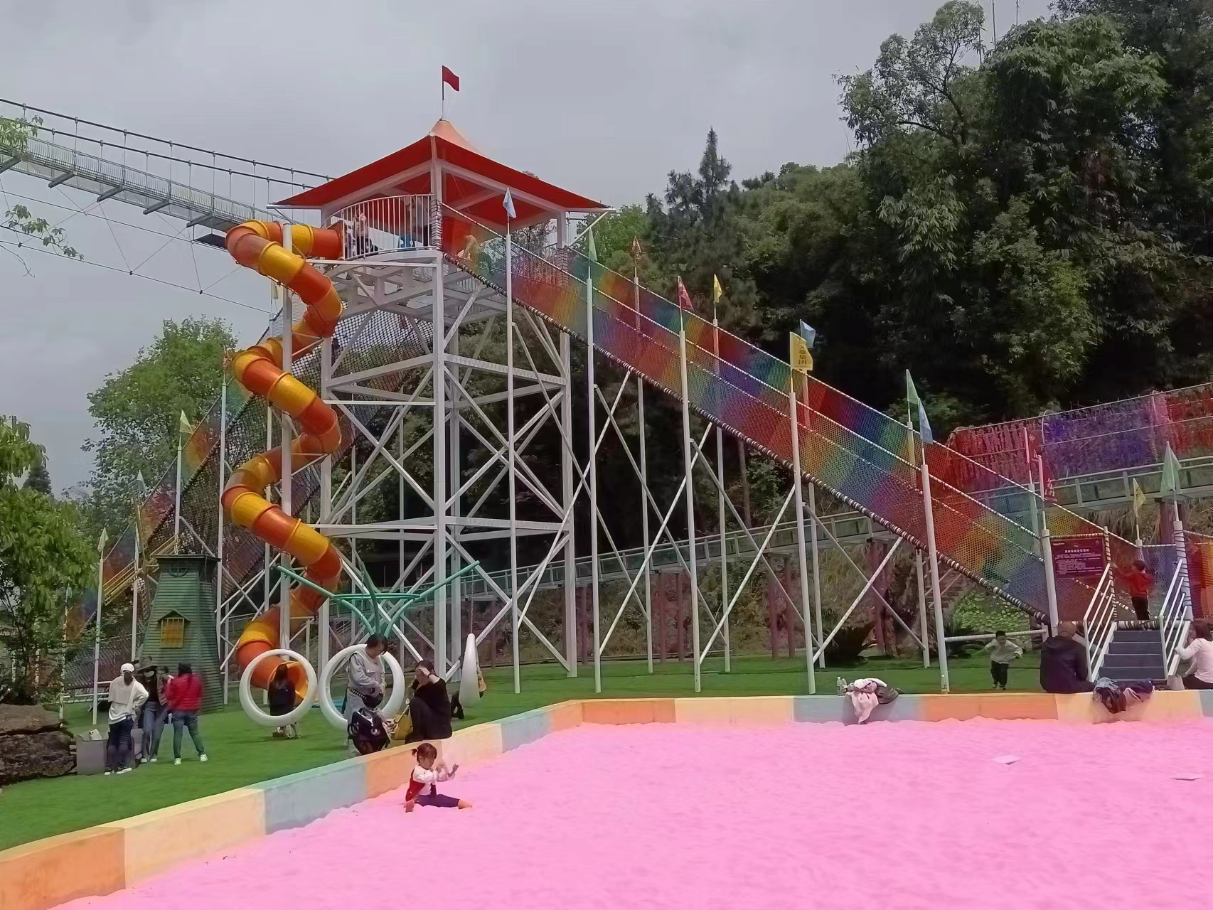 勇攀高峰是樂園的標志性設(shè)備,由攀爬網(wǎng)和和滑滑梯組成,中間安裝玻璃站臺,可以根據(jù)預算選擇高度和寬度,還可以和玻璃棧道結(jié)合做成樂園的地標性游樂項目。是大型親子游樂園的必備項目。