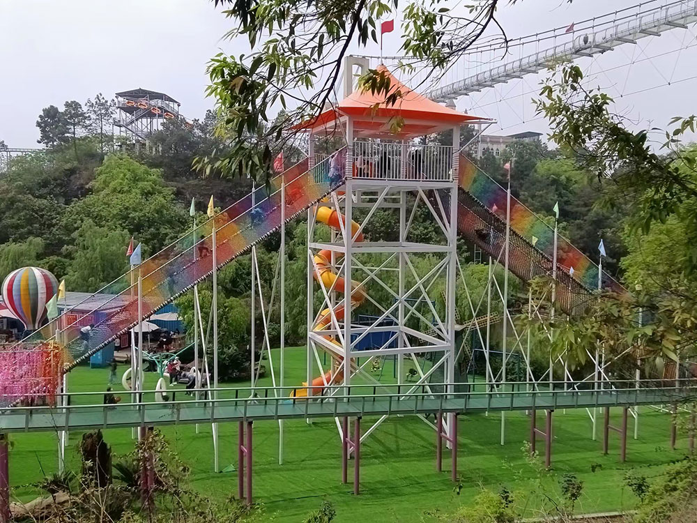 勇攀高峰是樂園的標(biāo)志性設(shè)備,由攀爬網(wǎng)和和滑滑梯組成,中間安裝玻璃站臺,可以根據(jù)預(yù)算選擇高度和寬度,還可以和玻璃棧道結(jié)合做成樂園的地標(biāo)性游樂項目。是大型親子游樂園的必備項目。